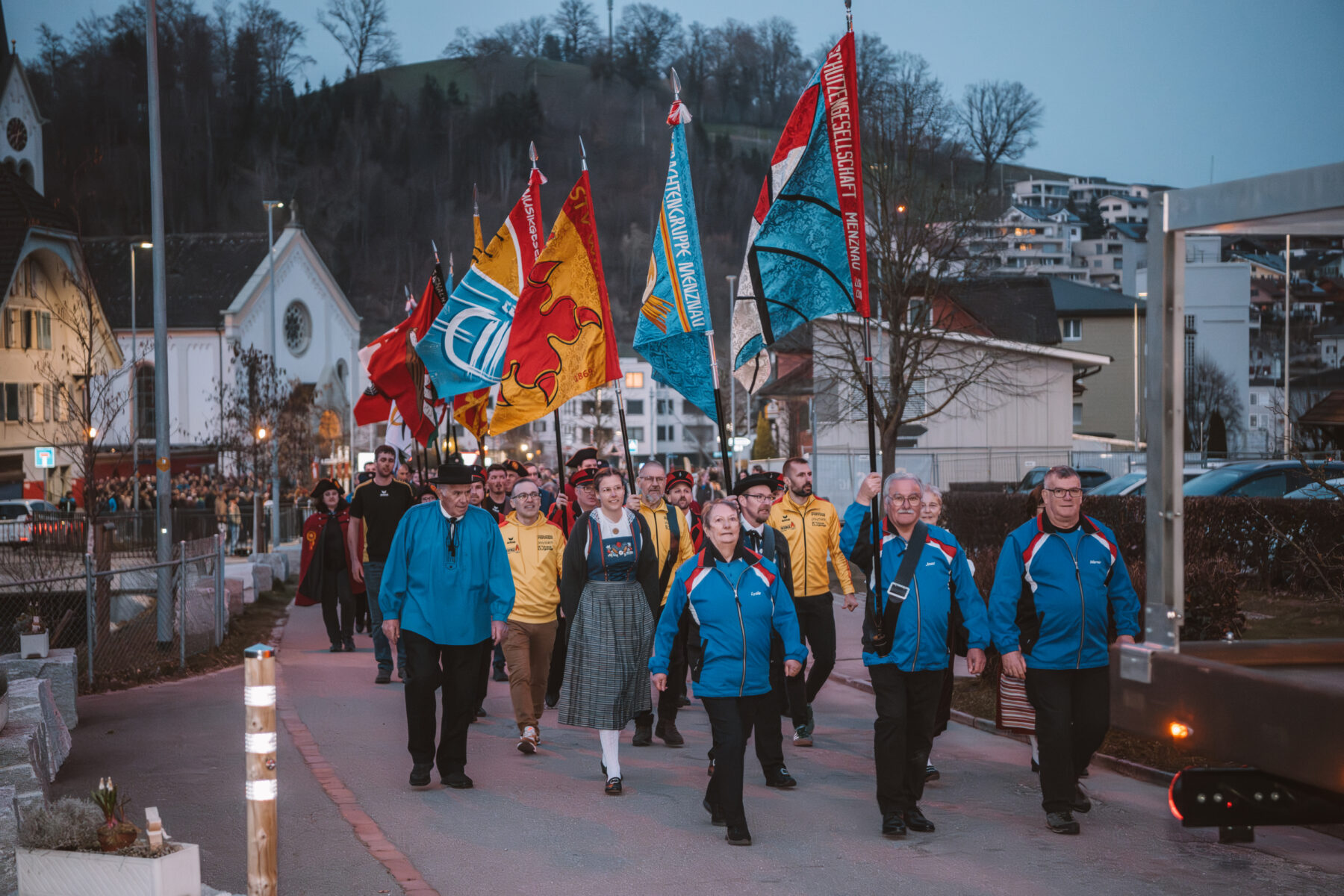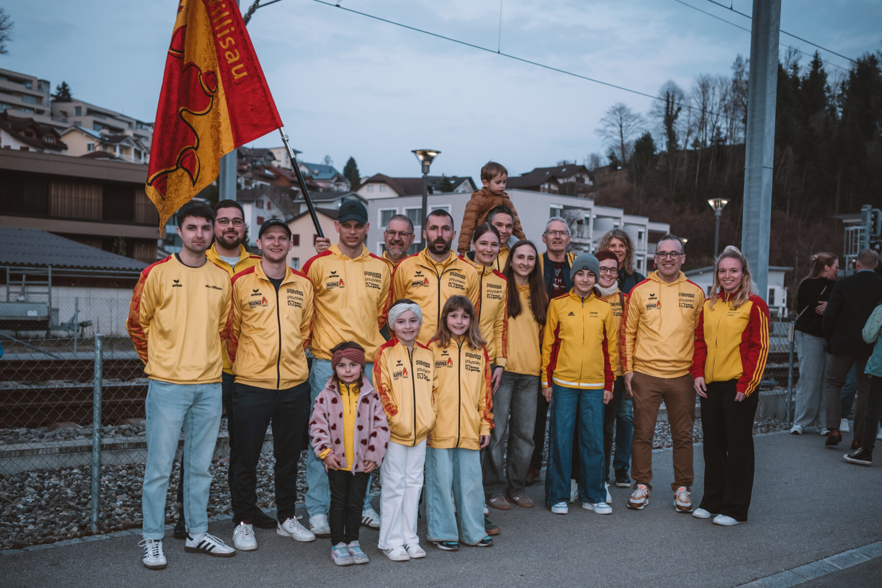 Die Freude und der Stolz waren auf dem Bahnhofsplatz in Menznau förmlich greifbar, als sich der festliche Umzug in Bewegung setzte. Angeführt von der Musikgesellschaft Menznau und begleitet von rund einem Dutzend Fahnendelegationen – darunter natürlich auch jene des STV Willisau, der seinem Rekordhalter stolz die Ehre erwies – zog die Festgesellschaft via Kreisel in Richtung Rickenhalle. Der absolute Blickfang: Ein Oldtimer-Lastwagen, auf dem Pilot Michael Vogt, Mario Aeberhard und unser Andi Haas das Bad in der Menge genossen. Mit strahlenden Gesichtern winkten sie dem zahlreich erschienenen Publikum am Strassenrand zu und präsentierten stolz ihr glänzendes Edelmetall aus Milano Cortina. Dahinter reihten sich Familie, Freunde, Bekannte und zahlreiche Vereinsmitglieder in den Tross ein.