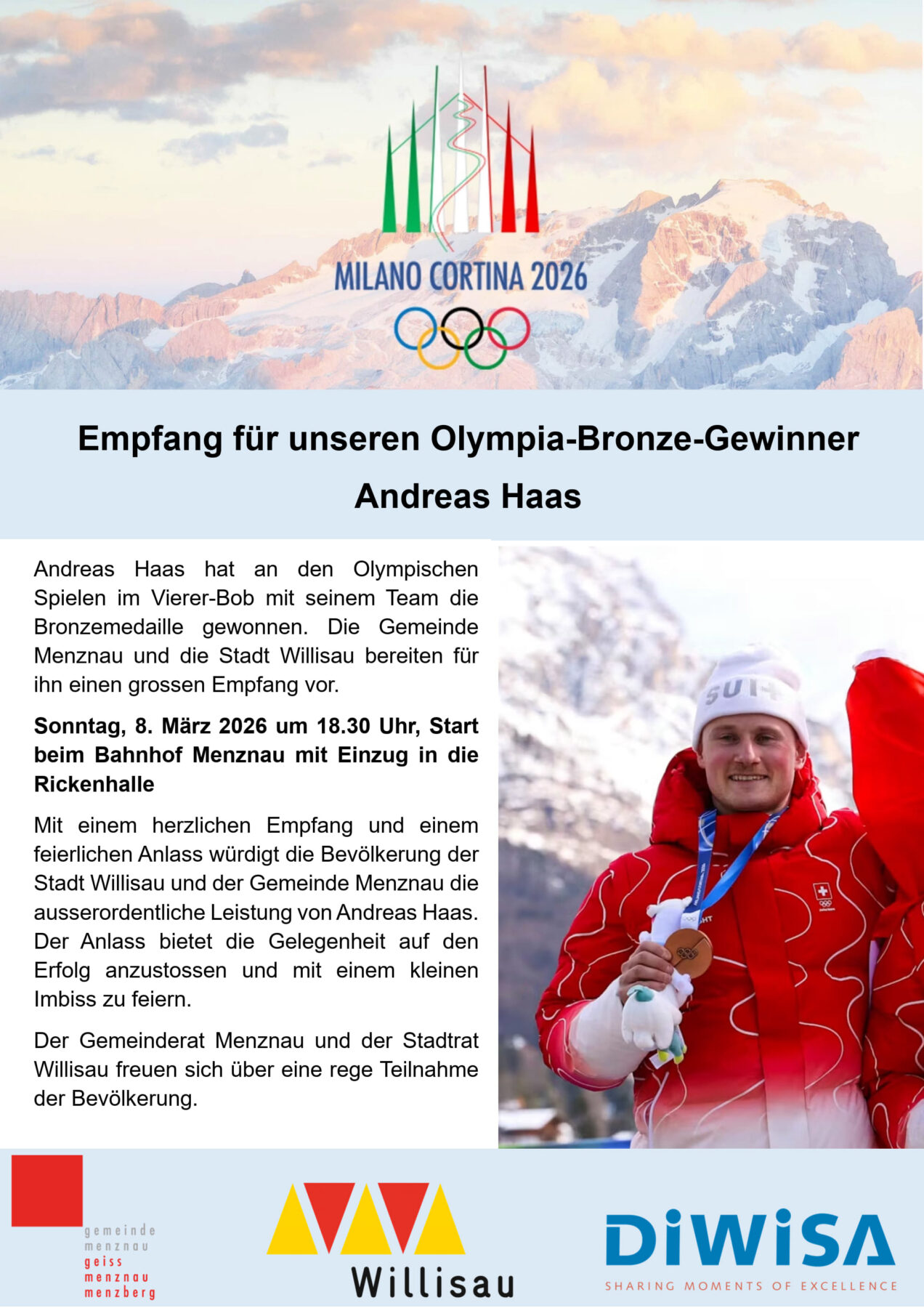 Zwei Wochen nach seinem grandiosen Gewinn der Olympischen Bronzemedaille im Viererbob an den Spielen in Milano Cortina wird unser Vereinsmitglied Andreas «Andi» Haas nun offiziell in seiner Heimat gefeiert. Da Andi in Menznau aufgewachsen ist, haben die Gemeinden Menznau und Willisau gemeinsam entschieden, den Empfang dort zu organisieren. Ein schöner Entscheid, der seine Wurzeln würdigt.